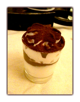 Battre la crème fleurette en chantilly (ou la préparer au siphon idéalement). Déposer une bonne cuillère (une arabesque le cas échéant) de chantilly sur chaque verrine. Placer les verrine sur un papier journal et saupoudrer de cacao à travers une passoire fine. Le journal vous permettra de ne pas (trop) salir votre cuisine. Servir avec un petit financier ou une madeleine fraiche. Accompagner avec un vieux banyuls.