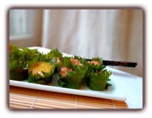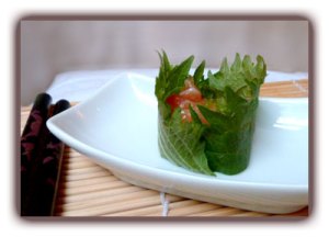 Shiso : des feuilles de la famille de la menthe, au gout anisé très particulier, traditionnellement servie avec le sashimi. Les feuilles vertes en plastique des restaus à sushi bas de gamme sont une représentation du shiso. On en trouve maintenant facilement dans les épiceries japonaises comme Kioko ou Issé.