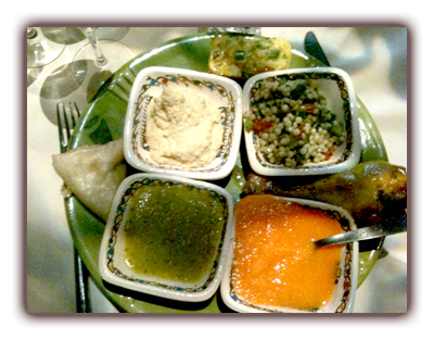 Les assiettes arrivent fièrement, présentant deux assortiments totalement différents (pas de recyclage facile entre les formules) de salades (fèves au cumin, petites pâtes à la marocaine, concombre à la menthe), de viandes (délicieuse kefta, poulet moelleux), d’omelettes, de briouats, et de petites choses délicieuses.