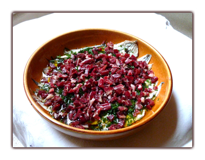 Dans un plat creux, versez un filet de bonne huile d’olive. Disposez les filets d’anchois, arrosez généreusement d’huile d’olive et du jus du citron. Poivrez au moulin, ne salez pas. Recouvrez d’une bonne quantité de ciboulette ciselée très finement et recouvrez des dés de jambon.