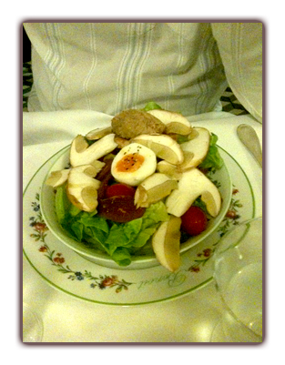 Salade Benoit : cèpes, magret, rillettes, petits légumes étuvés.