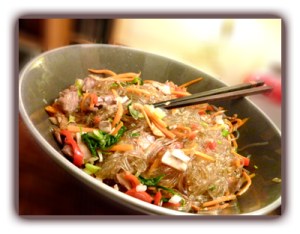 – et le délicieux Chapchae, un sauté de nouilles de patates douces au faux filet de boeuf  et aux légumes sautés : régalissime !