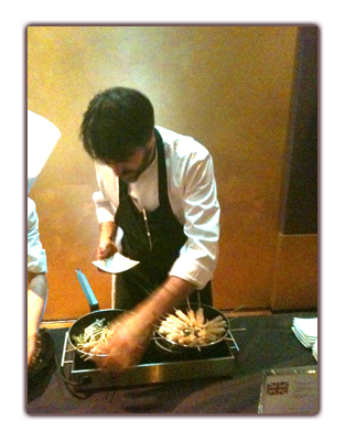 – Le plus « ça c’est 2010 »: Nuno Mundes, chef Portugais aujourd’hui établi à Londres. Regard sombre mais doux, il prépare des langoustines enveloppées de lard de Colonnata, cuites sur un lit de romarin fumant. Une belle dégustation, même si le lard est un peu trop présent à mon goût (il est cru et laisse donc une légère sensation de « gras froid » en bouche.) Mais c’est vraiment pour pinailler parce que c’était top, et pile dans l’air du temps.