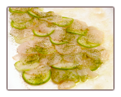 Carpaccio de St Jacques au thé matcha et aux radis green meat.