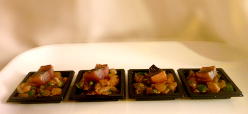 Bouchées de tartare de daurade et huitres à la coriandre et maquereau caramélisé.