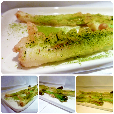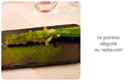 Une partition géniale du chef Christophe Pelé*, l’assemblage est juste merveilleux. Le poireaux est à la fois frais, fondant et piquant, légèrement sucré. Le tempura apporte croustillant et un léger gras. Le thé matcha (que j’aime décidément en cuisine) apporte son amertume, son côté poudré et sa saveur herbacée, fine et prononcée. Le résultat est fantastique.