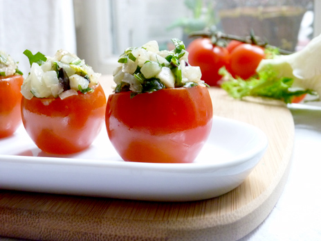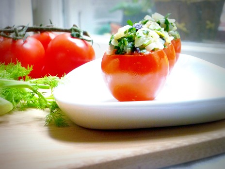 Remplir les tomates avec une petite cuillère, tassez bien la farce avec vos doigts et faites un petit dôme sur le dessus.