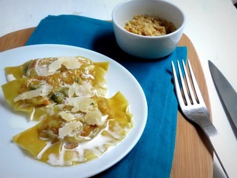 Une petite réserve : le parmesan dans la farce des ravioles n’est pas forcément une bonne idée, ou alors il faut avoir la main très légère et peut-être que j’en ai mis trop. Il faut dire aussi que j’avais pris des langoustines et pas de l’araignée, et forcément c’est très fin mais moins gouteux. Trouver de l’araignée de mer là où j’habite (en Alsace), c’est peine perdue : déjà le tourteau, les gens d’ici savent à peine ce que c’est et ils écarquillent des yeux bêtes quand on leur parle d’étrilles, alors des araignées, vous pensez…