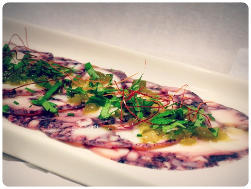 Tu sais quoi : ponzu + citron vert + coriandre ça me fait penser à de la cuisine fusion péruvienne comme les jeunes chefs espagnols d’origine péruvienne la pratiquent aujourd’hui. L’assaisonnement est furieusement ceviche avec sa touche japonaise enracinée dans leur cuisine et le poulpe en carpaccio très ibérique.