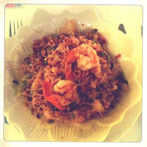 A la carte du Huen Penh, j’ai donc été ravie de découvrir qu’ils proposaient plusieurs de ces « priks », et celui que nous avons goûté ne m’a pas déçue. Il se composait de porc (dont je dois dire nous n’avons pas senti pas la présence en tant que telle), d’aubergines et de piment verts. Le résultat était onctueux, un peu comme un caviar d’aubergines très frais (et très pimenté), légèrement amer et avec une petite touche de sapidité signant tout de même la présence de la viande. Nous avons adoré.