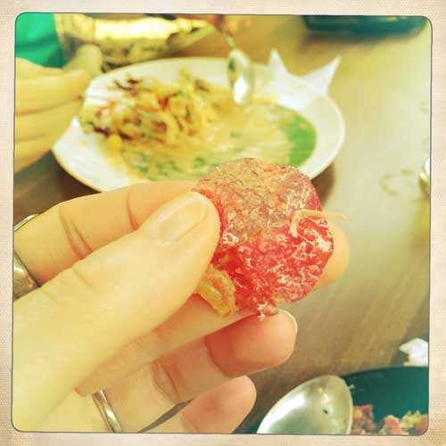 C’est un plat simple mais populaire, et, malheureusement, souvent maltraité. Pour le goûter, nous avons donc suivi les recommandations de Leela et traversé Chiang Mai en vélo pour nous rendre au pied de la mosquée, déguster ce Khao Soi qu’elle considère comme impeccable et parfaitement représentatif de ce qu’un Khao Soi doit être. La très chouette ballade, quoique longue (on s’est fait surprendre par les distances) valait l’effort – et le déjeuner fut parfait. Les saveurs sont vives et justes, le bouillon est savoureux et la recette refuse les aménagements habituels concédés aux touristes (trop de lait de coco, des cacahuètes partout).