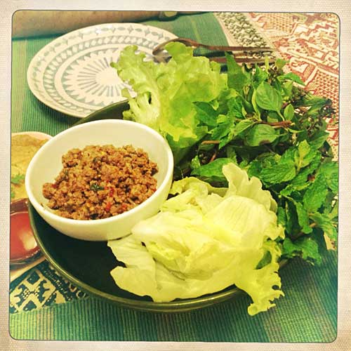 Pour finir ce petit tour des plats que nous avons préféré au Huen Penh, je ne peux pas ne pas mentionner le laarb moo. Cette salade de porc haché aux herbes se trouve dans n’importe quel resto thaï un peu sérieux en France, et comme j’en raffole, il me fallait la goûter sur place.