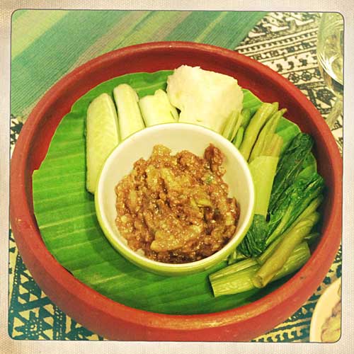 Les « priks » ** sont des condiments divers ultra parfumés, utilisés comme « dips », ou que l’on mélange simplement avec du riz. D’après Leela (toujours elle, mais que voulez-vous c’est ma référence en matière de cuisine thaïlandaise) , il existe des centaines de recettes de « priks » différents en Thaïlande  et ils sont un peu l’âme de la cuisine thaïlandaise. Nous avons d’ailleurs pu le constater souvent dans les adresses authentiques : il y a toujours sur la table un petit bol de crudités qui traîne avec une cuillère ou deux de pâte épicée, aux légumes ou à la viande.