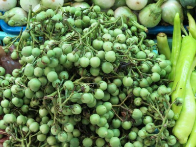 Je traîne parmi les stands d’herbes et de légumes, me fournir en petites aubergines.