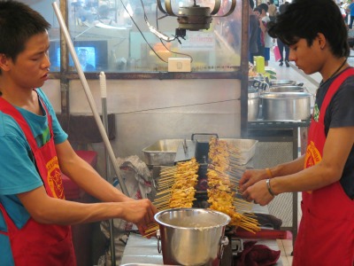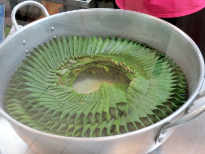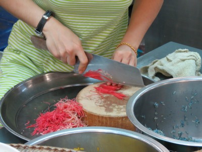 Un peu plus loin, deux femmes préparent des dumplings, petites bouchées vapeur façon dimsums, et leur adresse est assez spectaculaire. Elles se laissent gentiment filmer : on voit sur ce petit extrait vidéo avec quelle agilité la jeune fille entoure ses boulettes de fine pâte de riz. Elle nous montre également la décoction naturelle de fleurs qu’elle utilise pour teindre la pâte – c’est pas joli ?
