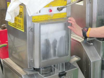 ortorkor-coco-rapeeIl passe les noix de coco dans une machine qui les râpe. Il récupère les copeaux obtenus et les met dans une presse mécanique. Le jus qui sort est la crème de coco. Il rajoute ensuite de l’eau dans les restes solides de la noix de coco, et repasse le tout à la presse, ce qui sort sera le lait de coco.