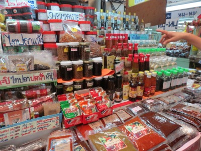 Dans cette zone du marché, nous avons passé un bon moment chez Prik Thai Chan (corner 4/48-49-51) que je vous recommande. La dame parlait un peu anglais, était charmante et nous a tout emballé de façon formidable. Je lui ai également pris des pâtes pour faire le Khao Soi – par contre, petit déception : j’espérais trouver du Nam Pla artisanal, pas vu, ni chez elle ni ailleurs.