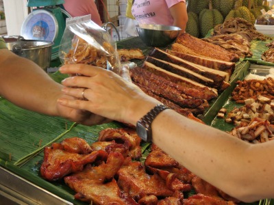 Un stand voisin propose du moo krob : de la graisse de porc grillée ultra-croustillante, un genre de graton à la mode thaï, et même meilleur que notre version française : c’est beaucoup plus craquant,  il y a moins de sensation de gras en bouche. Ce truc là je regrette de ne pas en avoir rapporté un camion, ça se conserve bien (et le peu que j’avais rapporté à été dévoré par notre ami Martin, lequel a fort bon goût et grand appétit).