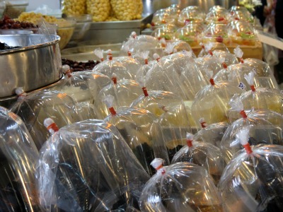 On trouve également sur ces stands différentes pâtes de currys semi-fraîches (en format poche plastique, très pratique), bien plus goûteuses et parfumées que les conserves que nous trouvons en France (je regrette d’ailleurs de ne pas en avoir pris dix fois plus). Egalement sur ces stands, je trouve de la pâte de crevettes (kapi) maison. Cette pâte est un indispensable de la cuisine Thaï, on la retrouve dans de très nombreuses recettes, je vous conseille d’en prendre, ça ne coûte pas bien cher et ça se conserve des mois (par contre, faites pas comme mamie, ne le gardez pas dans votre sac à main car ça passera pas dans l’avion ****) .