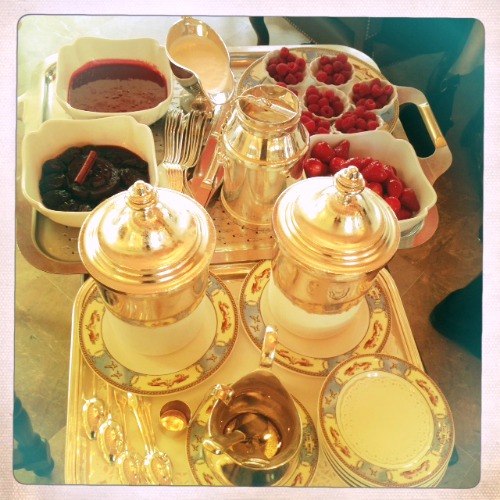 Le chariot des glaces me fascine, il y a là deux grands pots en argent massif, givrés par le froid. Le serveur fait ses quenelles d’une seule main, tant la glace est à température parfaite, souple. Le choix pourrait paraître modeste : une glace à la vanille, un sorbet à la fraise et c’est tout. Mais elles sont servies avec des framboises explosives, et avec des fraises juteuses, juste laquées de confiture, ce qui leur apporte une pointe de gourmandise parfaite.