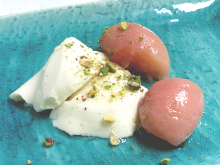 Au moment de servir, placez deux belles cuillères à soupe de yaourt pris dans chaque assiette. Ajoutez une demie pèche ou deux selon l’appétit des convives. Arrosez d’un peu de sirop (qui aura pris une jolie couleur rose), de quelques gouttes d’arak, et des pistaches légèrement concassées.