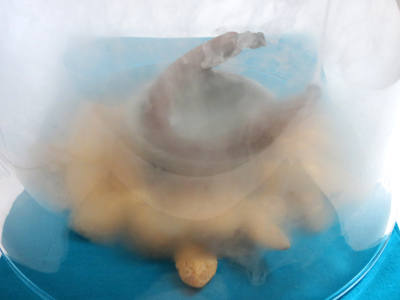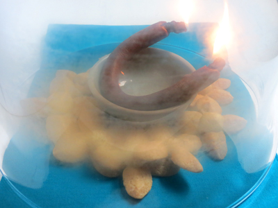 Une « bougie » courbée, composée de cire parfumée agglomérée autour d’une mèche. On l’allume, puis on la pose à côté de l’élément que l’on souhaite fumer (sablés, cheesecake, crème, meringues …). On couvre le tout d’une cloche en verre (un vase retourné chez nous).
