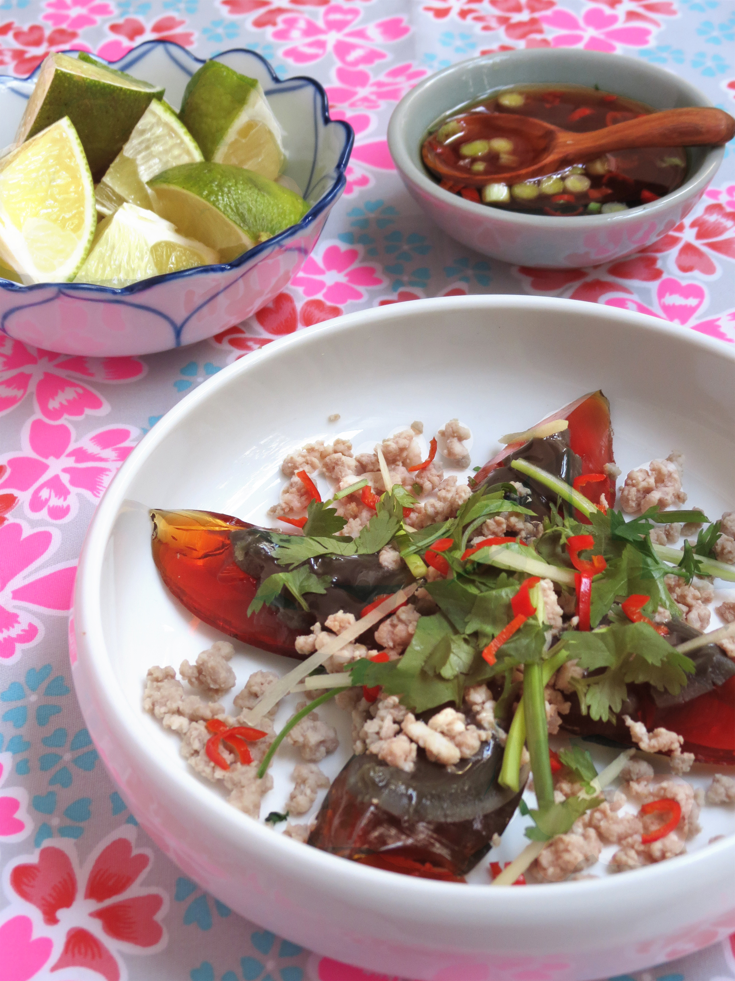 J’ai fini par trouver ce que je cherchais sur le blog She SImmers (qui est comme chacun sait le meilleur blog au monde de cuisine thaïlandaise***), une recette de salade d’œufs de cent ans au porc et au gingembre qui me paraissait parfaite.