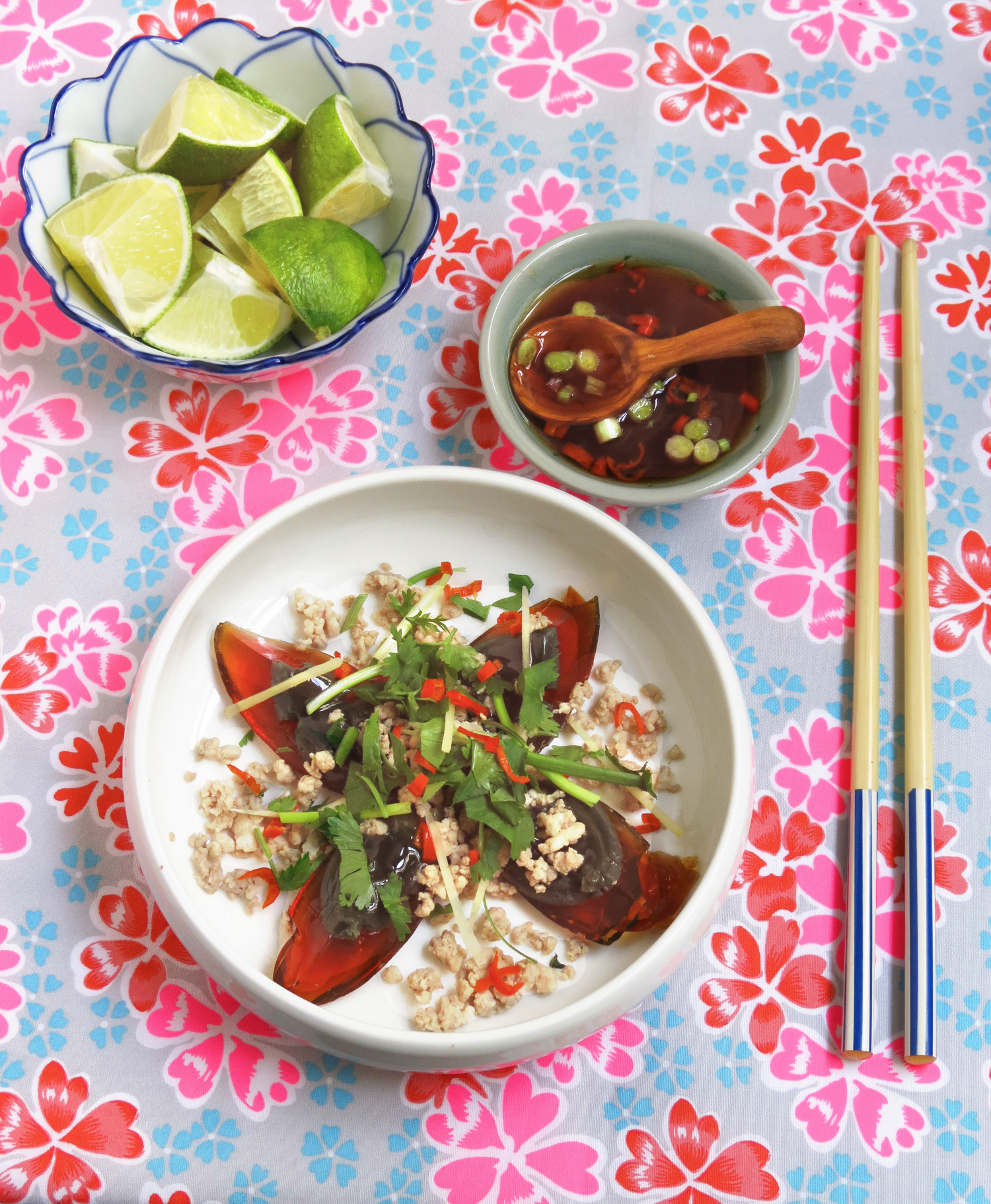 Dans un plat de service, disposez les œufs de cent ans coupés en quartiers, le gingembre coupé en fins bâtonnets, la ciboule émincée, le piment épépiné et émincé, la viande tiède et la coriandre.
