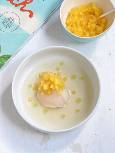 Saint Jacques au bouillon dashi, ananas et huile de ciboulette, par David Chang.