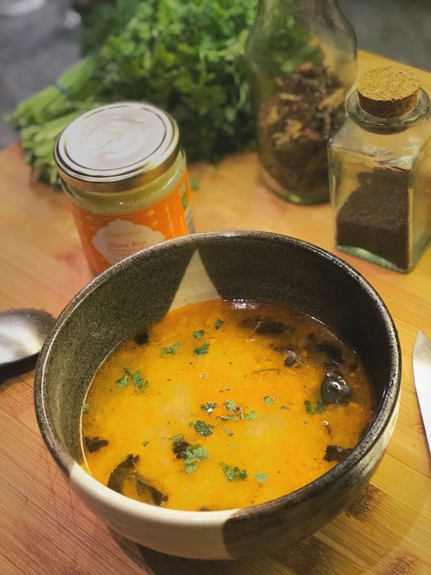 J’ai donc suivi les consignes de Sophie qui parle d’une interprétation assez libre, donc faites vous plaisir avec les épices que vous avez. Faites revenir les aromates dans le ghee. Quand cela sent bon, versez directement sur le bouillon (en filtrant ou non). Ajoutez les feuilles de coriandre fraîche et servez dans la foulée.