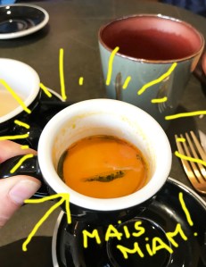 Nous y déjeunions donc l’autre jour entre copines quand Manoj nous a fait goûter, dans une petite tasse à café, un nouveau truc qu’il nous présente comme un « bouillon de homard ». Cette petite chose mes amis m’a remuée jusqu’aux entrailles. Le bouillon, délicat, sentait les épices d’Indes et la feuille de curry. Une petite huile rouge et piquante donnait de la rondeur, de la gourmandise, et tout cela venait sublimer les saveurs du homard bleu, comme transcendé par ce mélange de parfums d’orient.