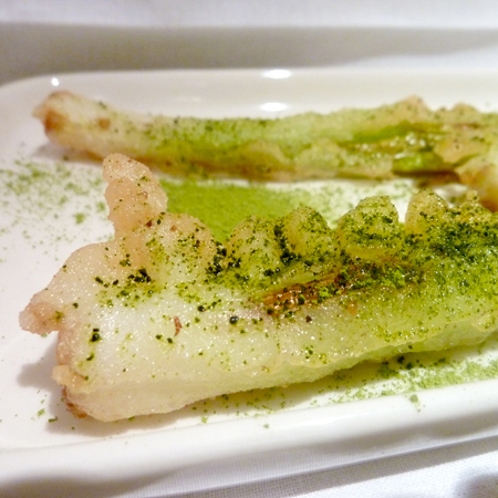 Une partition géniale du chef Christophe Pelé*, l’assemblage est juste merveilleux. Le poireaux est à la fois frais, fondant et piquant, légèrement sucré. Le tempura apporte croustillant et un léger gras. Le thé matcha (que j’aime décidément en cuisine) apporte son amertume, son côté poudré et sa saveur herbacée, fine et prononcée. Le résultat est fantastique.