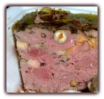 Terrine de canards colverts au foie gras et un consommé bien tourné.